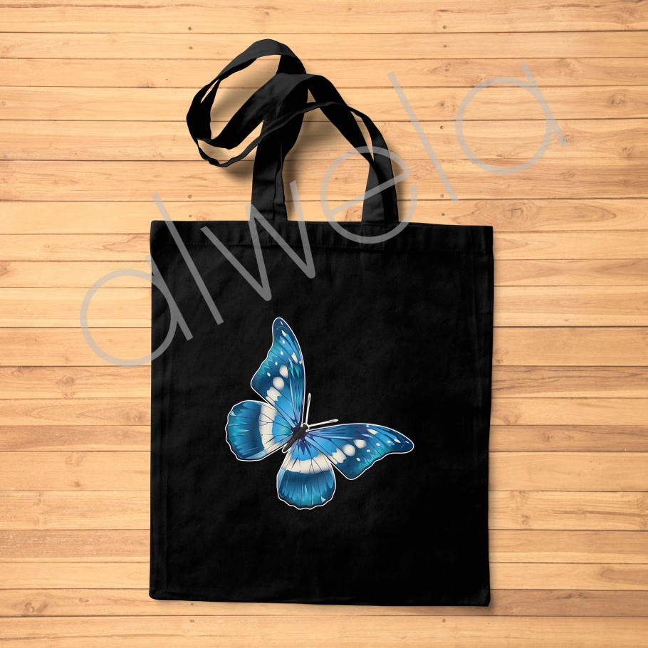 Mavi Kelebek Motifli Omuz Askılı Siyah Bez Çanta 35x40 CM