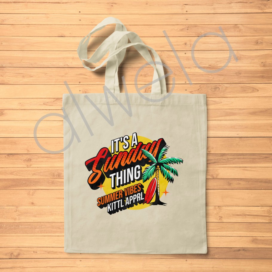 Güneşli günlerin ve tatilin enerjisini taşıyan bu tropikal baskılı tote çanta ile yaz stilinize canlılık katın! Üzerindeki "It's a Sunday Thing" yazısı, palmiye ağacı ve sörf tahtası figürleriyle tam bir yaz havası estiriyor. Eko dostu ham bez k