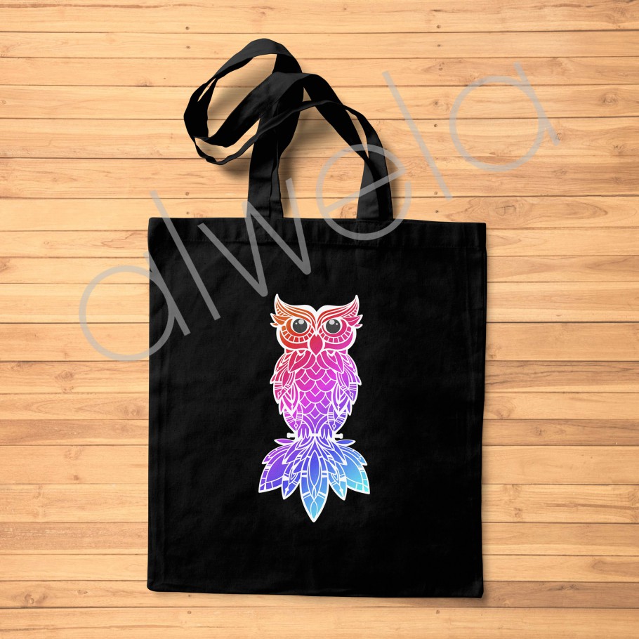 Canlı renklerde baykuş deseniyle siyah bez tote çanta. Bilgelik ve stilin buluştuğu bu eşsiz omuz çantası ile fark yaratın. Hemen keşfedin!