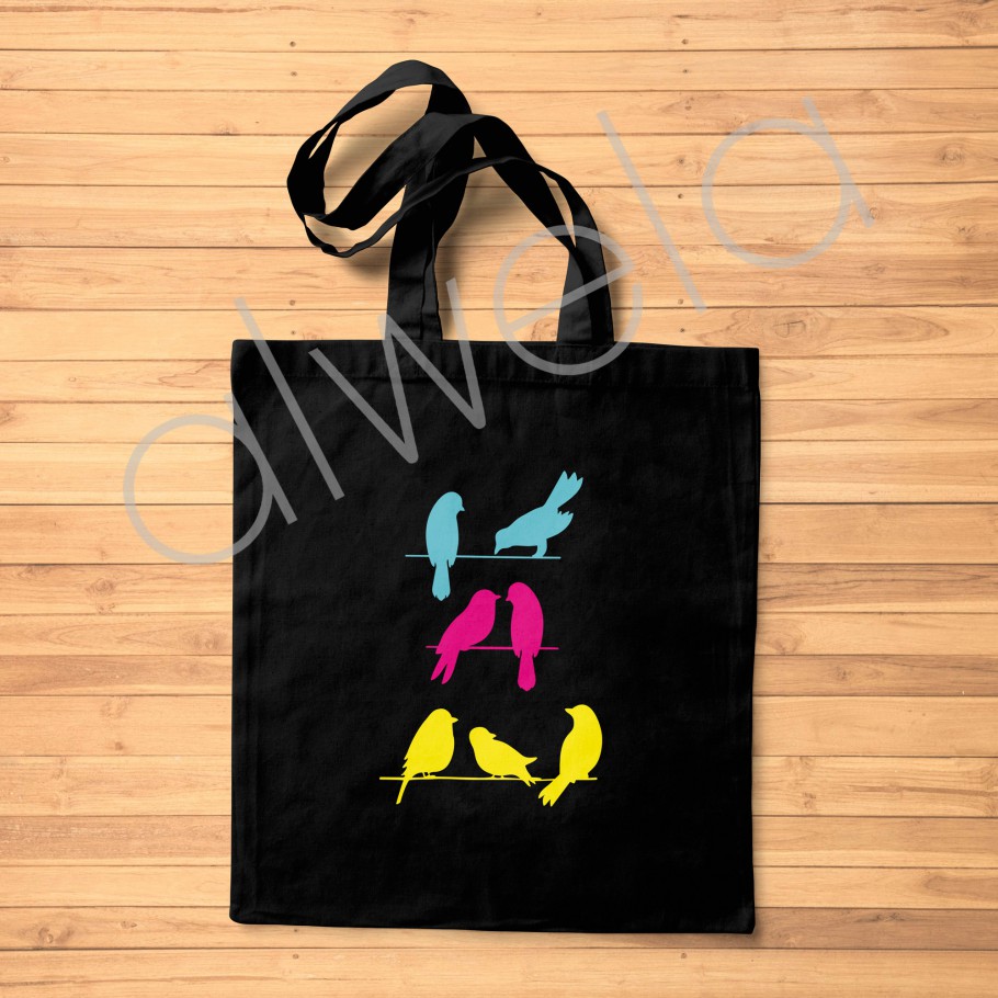 Etiketler: Siyah bez çantarenkli kuşlarkuş silueti çantatote bagomuz çantasısiyah kanvas çantaminimalist çantadoğa temalı çantamodern tasarımgünlük çantaalışveriş çantasımavi pembe sarı kuşlar.