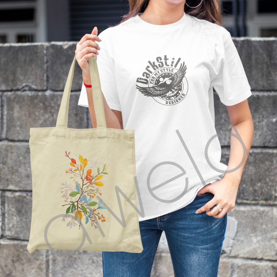Sonbaharın sıcak ve huzurlu renklerini yansıtan bu ekru ham bez tote çanta ile stilinize doğal bir dokunuş katın. Üzerindeki zarif yaprak ve çiçek baskısı, canlı turuncu, sarı ve mavi tonlarıyla mevsime uyum sağlar. Eko dostu ve dayanıklı yapısıyla günlük