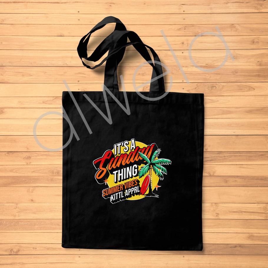 Siyahın şıklığı, yazın enerjisiyle buluşuyor! Bu tropikal baskılı siyah ham bez tote çanta ile stilinize canlılık katın. Üzerindeki "It's a Sunday Thing" yazısı, palmiye ağacı ve sörf tahtası figürleriyle tam bir yaz havası estiriyor. Dayanıklı